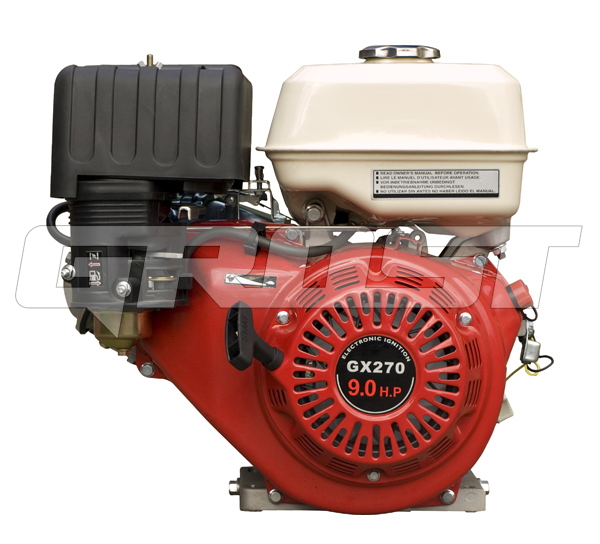 Масло (рекомендованное) - 10W30, 10W40 Модель двигателя - GX270 (S тип) Мощность двигателя - 6.6 кВт (9 л.с.) / 3.600 об/мин Мощность на валу - 4.6 кВт (6.2 л.с.) / 3.000 об/мин5.1 кВт (6.8 л.с.) / 3.600 об/мин Объём двигателя - 270 см. куб. Объём масла в картере, л - 1,1 л Полезная мощность - 6.0 кВт (8.0 л.с.) при 3.600 об/мин Размер вала - S тип Расход топлива - 313 г/кВт.ч - 230 г/л.с.ч2.5 л/ч при 3600 об/мин Система зажигания - транзисторная Тип двигателя - 4-тактный, OHV Топливо - бензин АИ92, АИ 95 Крутящий момент max - 19,1 Нм / 1.9 кг/м / 2.500 об/мин Запуск - ручной Диаметр x Ход поршня - 77 x 58 мм Базовый вес - 25 кг Базовые габариты - 380 x 430 x 410 мм Ёмкость топливного бака, л - 5,3 л 4-тактный верхнеклапанный бензиновый двигатель с системой воздушного охлаждения, цилиндром, расположенным под углом 25 градусов, и горизонтальным коленвалом